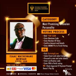 Promising Ghanaian media personality, security personnel, and entrepreneur Isaac Wathewane Mensah has earned two prestigious nominations at the 2024 edition of the Ghana Change Makers Awards. His growing influence in the media landscape, coupled with his diverse business ventures, has landed him nominations for “National Brand of the Year” and “Most Promising Ghanaian Personality” awards at this year’s edition.