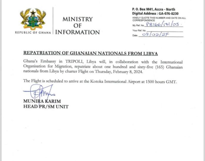Ghana’s Embassy in Tripoli, in partnership with the International Organization for Migration (IOM), successfully evacuated and repatriated 165 Ghanaians from Libya to Ghana.