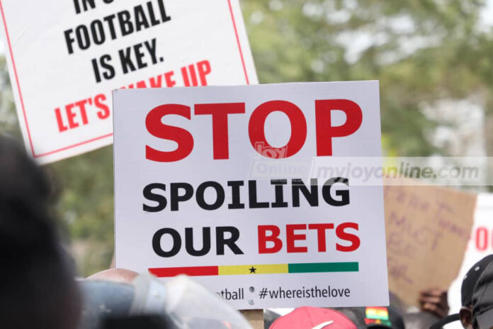 The placards at the demonstration bore inscriptions such as “stop spoiling our bets” and “we used to be the Brazilians of Africa, what happened?”